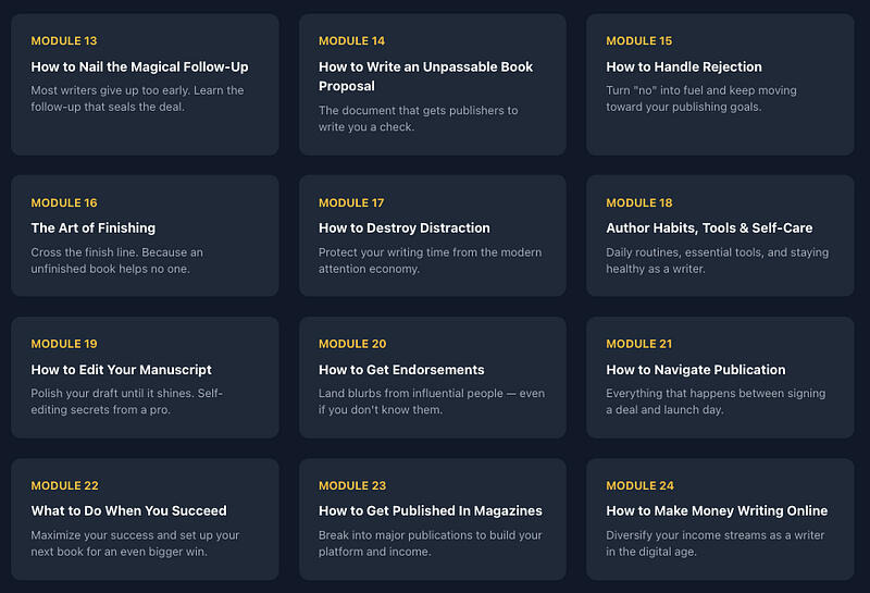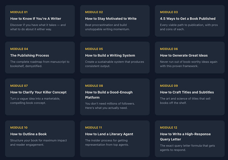 This Is the World’s Most Transparent and Least-BS Publishing CourseLet me be brutally honest with you upfront:✗ This course will NOT teach you how to write.✗ This is not a “get rich quick” scheme. Publishing is a long game.What this course will do is show you exactly how to GET PUBLISHED. The entire process, from idea to bookshelf, laid bare with zero fluff.Most publishing courses are taught by people who’ve published one book, or worse, people who’ve never published at all. They give you theory. I give you the exact playbook I’ve used to build a six-figure writing career with six published books.The Publishing Course is more in-depth and more specific than anything else I’ve seen out there. It took our team hundreds of hours to shoot and edit.119 Videos. 13+ Hours. Everything You Need.A deep-dive into insider author tactics that most writers never learn.Here’s exactly what you’ll master: